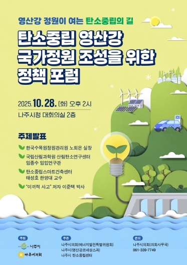 [뉴스스텝] 나주시의회는 나주시와 오는 28일 오후 2시, 나주시청 대회의실에서 '탄소중립 영산강 국가정원 조성을 위한 정책포럼'을 공동 개최한다고 21일 밝혔다. 이번 포럼은 탄소중립 실현을 위한 다양한 전략을 모색하고, 향후 영산강 국가정원 지정의 구체적 방향을 논의하기 위해 마련됐다.