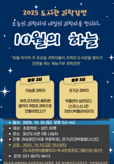 [뉴스스텝] 고양특례시 일산도서관에서는 과학자들의 재능기부 도서관 과학 강연프로그램 ‘10월의 하늘’을 운영한다.