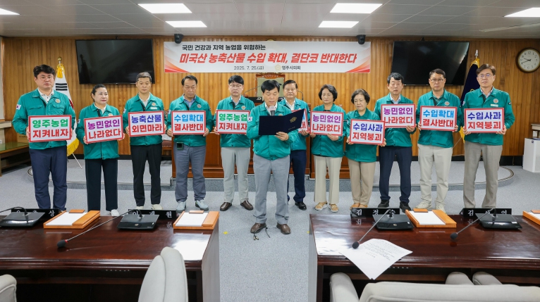 [뉴스스텝] 영주시의회는 7월 25일, 정부가 한미 통상협상 과정에서 미국산 농축산물 수입 확대 및 비관세 장벽 완화 방안을 협상 카드로 검토 중이라는 보도와 관련하여 강력한 우려를 표명하며‘미국산 농축산물 수입 확대 반대 성명서’를 발표했다.