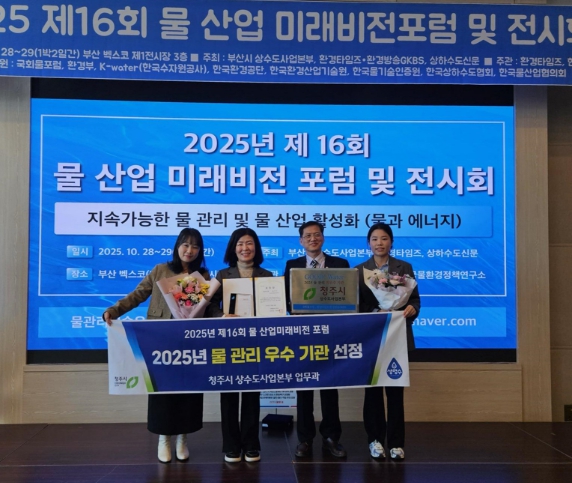 [뉴스스텝] 청주시 상수도사업본부는 28일 부산 벡스코에서 개최된 ‘제16회 물 산업미래 비전 포럼’에서 ‘물 관리 우수기관’으로 선정돼 상을 받았다.