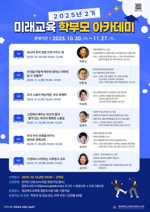 [뉴스스텝] 경상북도교육청 점촌도서관은 10월 30일부터 11월 27일까지 학부모 및 일반인을 대상으로 2025년 2기'미래교육 학부모 아카데미'를 운영한다.