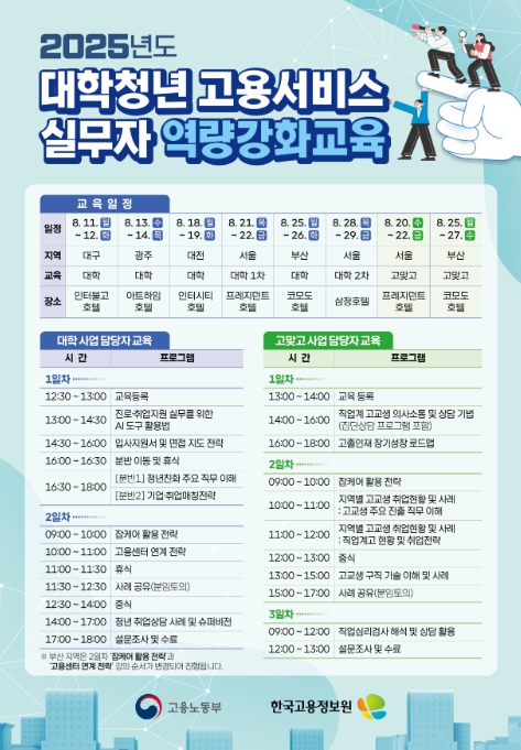 그 외 서울과 부산에서 각기 ‘고교생 맞춤형 고용서비스’실무자를 대상으로 한 별도의 교육이 운영되며 ‘직업계 고교생 의사소통 및 상담기법’, ‘지역별 고교생 취업현황 및 사례’, ‘고교생 구직기술 이해 및 사례’등에 대해 전문내용을 소개한다.