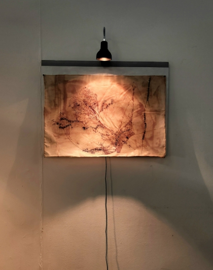 ▲ 강지율, 〈새와 새가 만나고〉, 2025, 천연 고무액에 주삿바늘로 시온물감, 실크스크린, 마판, 열전등, 50x75cm. (이미지: 작가 제공) |