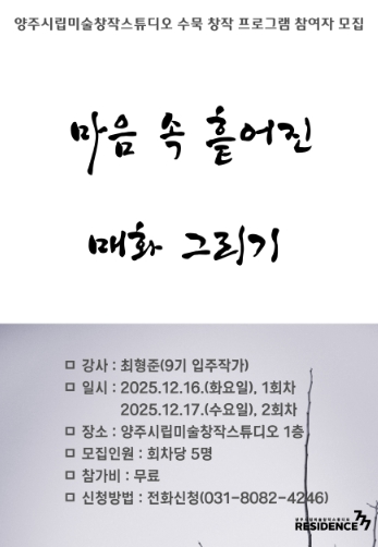 [뉴스스텝] 양주시립미술관이 오는 12월 17일과 18일 이틀간, 양주시립미술창작스튜디오 9기 입주작가 최형준이 진행하는 창작 수묵화 프로그램 《마음 속 흩어진 매화 그리기》의 참여자를 모집한다.