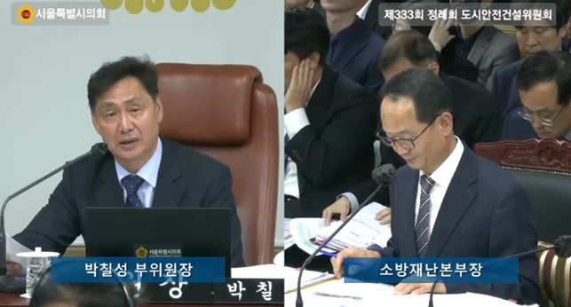 [뉴스스텝] 서울특별시의회 도시안전건설위원회에서 부위원장으로 의정활동 하고 있는 박칠성 시의원(더불어민주당, 구로4)은 지난 5일 열린 서울특별시의회 제333회 정례회 도시안전건설위원회 소관 소방재난본부 행정사무감사에서 화재안전 사각지대의 문제점을 지적하고 실효성 있는 대책 마련을 촉구했다.