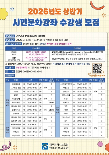 [뉴스스텝] 광주시교육청금호평생교육관은 오는 3~6월 ‘2026년 상반기 시민문화강좌’를 운영한다.