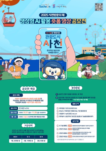 [뉴스스텝] 사천시는 2025 사천방문의 해를 맞아 시의 관광자원과 관광 캐릭터에 대한 관심과 인지도를 제고하기 위한 생성형 AI 활용 숏폼 영상 공모전을 10월 31일부터 11월 28일까지 개최한다.