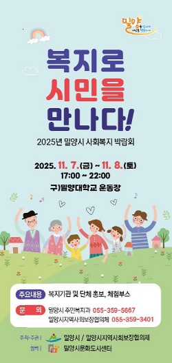 [뉴스스텝] 경남 밀양시는 오는 7일부터 8일까지 이틀간 구 밀양대학교 운동장에서 ‘복지로 시민을 만나다!’를 주제로 ‘2025년 밀양시 사회복지박람회’를 개최한다고 4일 밝혔다.