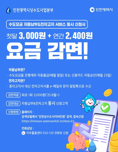 [뉴스스텝] 인천광역시 상수도사업본부는 시민들의 요금 납부 편의를 높이고 행정 효율성을 제고하기 위해 수도요금 전자고지 및 자동납부를 신청하는 시민에게 요금 감면 혜택을 제공한다고 밝혔다.