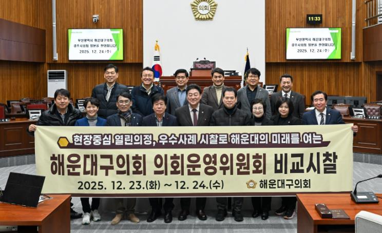 김상수 의회운영위원장은 “이번 시찰을 통해 리모델링으로 쾌적하고 선진화된 경주시의회의 청사 환경과 체계적인 공간 구성을 직접 확인할 수 있었다”며, “오는 2027년 말 입주를 목표로 건립 중인 해운대구의회 신청사에 이번 벤치마킹 결과를 적극 반영하여, 의원들이 의정 활동에 온전히 전념할 수 있는 현대적인 시설 환경과 직원들이 자부심을 갖고 일할 수 있는 쾌적한 근무 여건을 조성하는 데 최선을 다하겠다.”고 밝혔다.