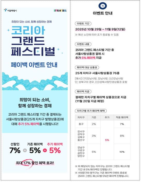 서울시는 자치구별 상품권 구매 시 적용되는 7% 구매할인율과 기존 5%, 추가 5% 페이백을 합산하면 최대 17% 할인 효과를 누릴 수 있다고 설명했다.