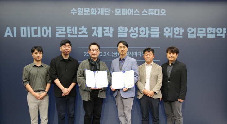 [뉴스스텝] 수원문화재단 미디어센터는 지난 24일 모피어스 스튜디오와 ‘AI 기반 콘텐츠 창·제작 협력 체계 구축’을 위한 업무협약(MOU)을 체결했다.