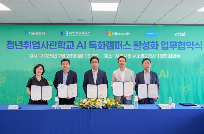 서울시는 7월 28일 시청 서소문2청사에서 대한상공회의소, 한국마이크로소프트, 세일즈포스코리아, 인텔코리아와 청년취업사관학교 AI 특화캠퍼스 활성화를 위한 업무협약(MOU)을 체결했다고 밝혔다.