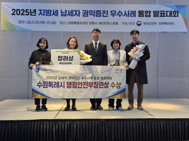 [뉴스스텝] 수원특례시가 행정안전부 주관으로 20~21일 강릉시 세인트존스호텔에서 열린 ‘2025년 납세자 권익 증진 우수사례 통합 발표대회’에서 장려상을 받았다.