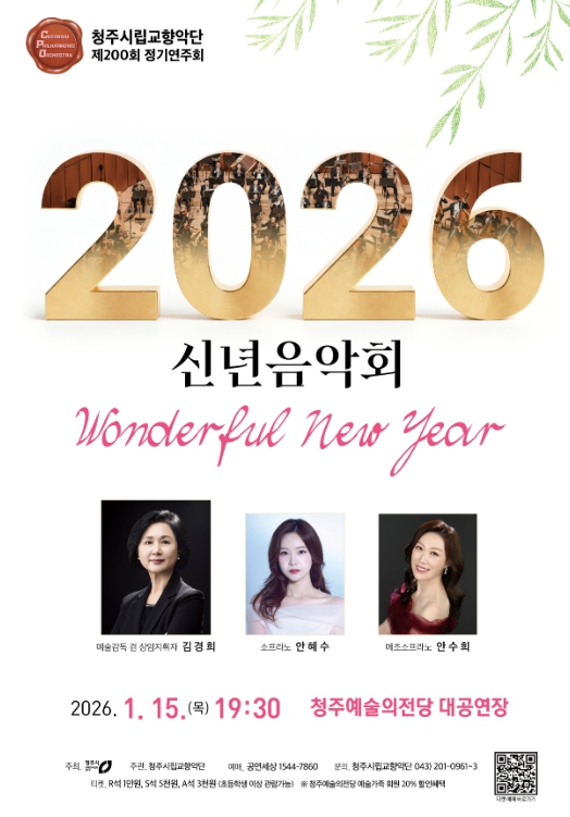[뉴스스텝] 청주시립교향악단(예술감독 겸 상임지휘자 김경희)은 오는 2026년 1월 15일 오후 7시 30분 청주예술의전당 대공연장에서 제200회 정기연주회 ‘2026 신년음악회–Wonderful New Year’공연을 선보인다.