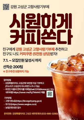 [뉴스스텝] 고성군은 7월부터 모집인원 달성 시까지 고향사랑기부제 활성화를 위한 ‘친구 추천 커피쏜다!’ 이벤트를 진행한다.