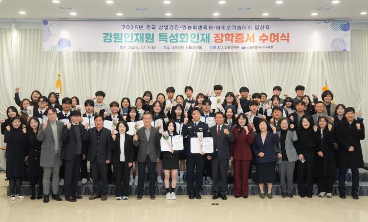 [뉴스스텝] 강원특별자치도교육청은 12월 1일, 춘천 세종호텔에서 전국대회에서 우수한 성적을 거둔 도내 특성화고 학생들을 격려하기 위한 장학증서 수여식을 개최했다.