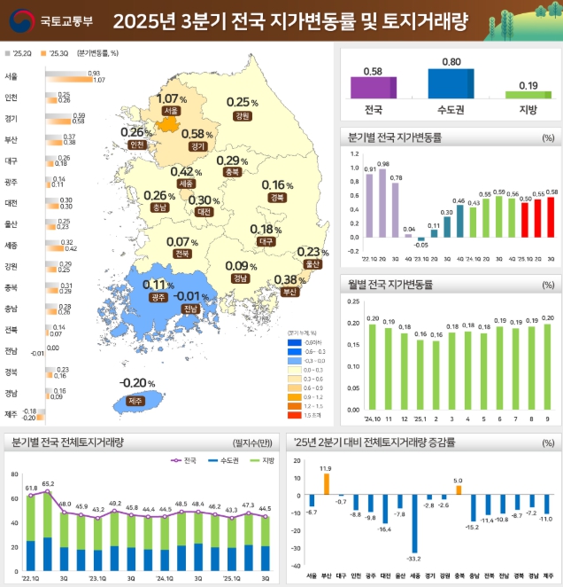 [뉴스스텝] 국토교통부와 한국부동산원(원장 손태락)은 '25년 3분기 지가변동률 및 토지거래량을 발표했다.