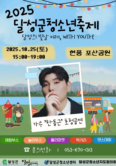 [뉴스스텝] 달성군청소년센터(관장 류명구)는 25일 오후 3시부터 현풍 포산공원에서 ‘달성의 빛날 미래, With Youth’를 주제로 청소년과 지역주민을 위한 ‘2025 달성군 청소년 축제’를 개최한다고 밝혔다.