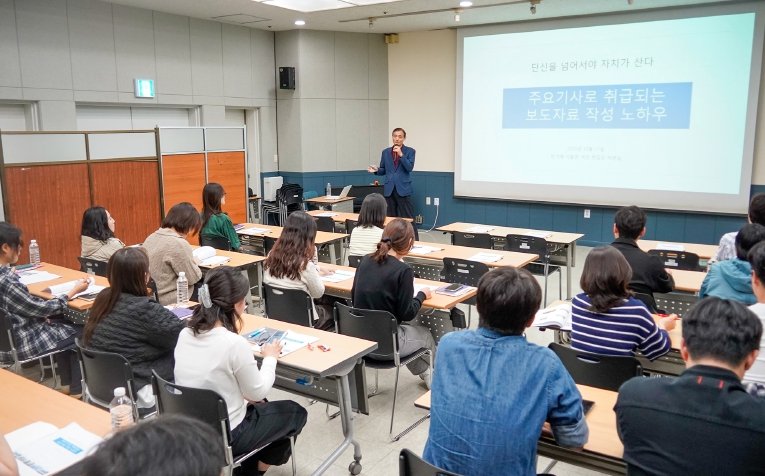 이날 강의는 한겨레신문 ‘서울&’ 섹션 편집장 하변길 기자가 맡아 ‘단신을 넘어서야 자치가 산다’를 주제로 2시간 동안 진행됐다. 하 기자는 보도자료의 기사화 가치와 기획력, 기자들이 주목하는 자료 구성, 제목과 리드문 작성 요령, 사진·캡션 작성 실무 등을 구체적인 사례를 통해 설명했다.