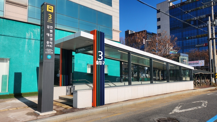 [뉴스스텝] 광주도시철도 1호선 김대중컨벤션센터역(마륵역)과 남광주역의 역사 외부 캐노피가 시인성 높은 표준 디자인으로 새단장을 마쳤다.