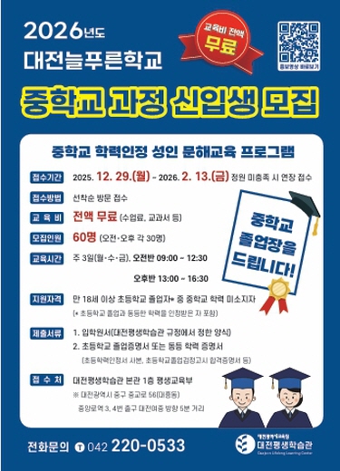 [뉴스스텝] 대전평생학습관은 2026년 2월 13일까지 2026년 대전늘푸른학교 중학교 학력인정 과정 신입생을 모집한다고 밝혔다.