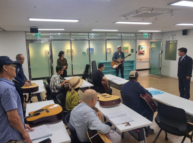 [뉴스스텝] 고성군이 운영하는 고성군종합사회복지관 분관에서는 10월 17일 저녁, 야간노래교실과 통기타반 수강생들을 격려하기 위해 이상근 군수가 직접 현장을 방문했다.