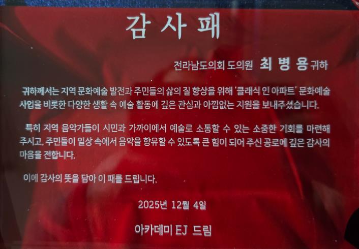 [뉴스스텝] 전라남도의회 최병용 의원(여수5, 더불어민주당)이 지역 문화예술 발전과 주민 삶의 질 향상에 기여한 공로를 인정받아 지난 4일 지역 예술교육 기관인 ‘아카데미 EJ(대표 이은주)’로부터 감사패를 수상했다.