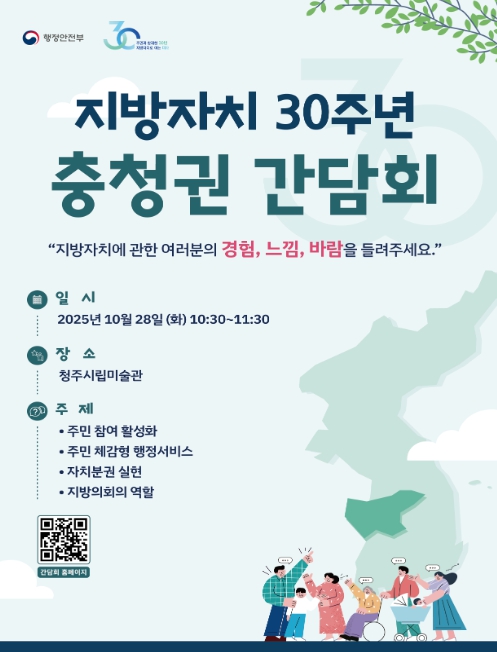 [뉴스스텝] 행정안전부는 10월 28일 충청북도 청주시립미술관에서 민선 지방자치 30주년 충청권 간담회를 개최한다고 밝혔다.