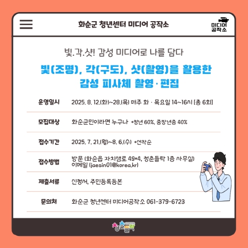 [뉴스스텝] 화순군은 오는 8월12일 오후 2시 화순군 청년센터(청춘들락) 미디어공작소에서 군민을 대상으로 조명과 구도를 활용한 나만의 감성을 미디어로 담는 교육을 진행한다고 밝혔다.