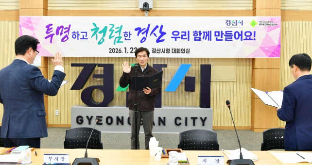 [뉴스스텝] 경산시는 23일 경산시청 대회의실에서 2026년 간부 공무원 반부패·청렴실천 결의대회를 개최했다.