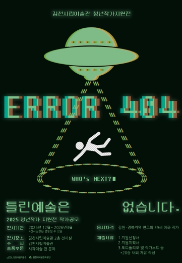 [뉴스스텝] 김천시시설관리공단이 운영하는 김천시립미술관은 지역 청년예술가의 창작 활동을 지원하고 예술적 성장을 돕기 위한 〈2025 청년작가 지원전 – ERROR 404 틀린 예술은 없습니다〉의 참여 작가를 모집한다고 밝혔다.