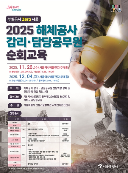 [뉴스스텝] 서울시는 2025년 11월 26일과 12월 4일, 서울역사박물관 야주개홀에서 해체공사 감리·담당공무원 순회교육을 진행한다고 밝혔다. 해체공사 위험요인을 근본적으로 차단하기 위해 현장에서 즉시 적용 가능한 해체공사 실무 중심 역량강화 안전교육이 진행되며 제6기 해체공사 감리자 및 자치구 해체공사 인허가·상시점검 담당 공무원이 대상이다.