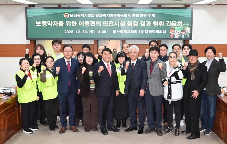 [뉴스스텝] 울산광역시의회 문화복지환경위원회 이영해 의원은 30일 오후 2시 4층 다목적회의실에서 '보행약자를 위한 이동편의 안전시설 점검 결과 청취 간담회'를 개최하고, 보행약자의 안전한 이동환경 조성을 위한 개선방안을 논의했다.
