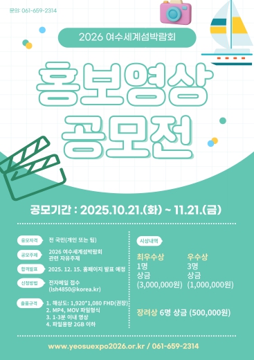 [뉴스스텝] (재)2026여수세계섬박람회조직위원회가 11월 21일까지 ‘2026여수세계섬박람회 홍보영상 공모전’을 개최한다.