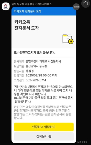 ▲ 전자고지 카카오톡 화면 예시 |