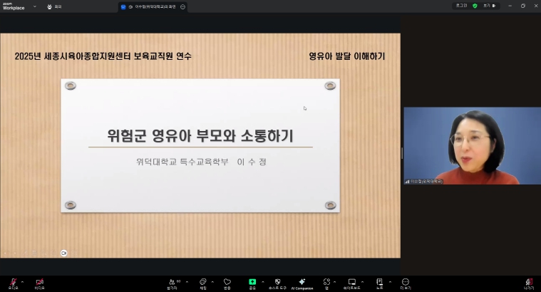 이 날 교육은 △ 위험군 영유아 부모의 심리적 특성 및 교사 지원 전략 △ 위험군 영유아 부모와의 상담 방법 등으로 구성됐다.