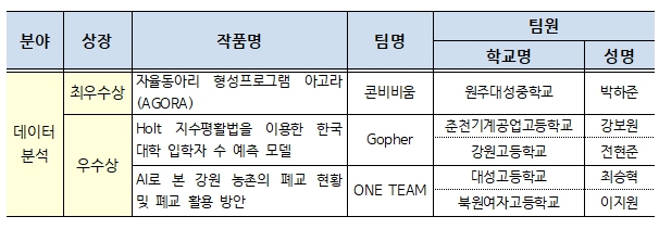 이외에도 ‘고퍼(Gopher)’팀은 ‘홀트(Holt) 지수평활법을 이용한 한국 대학 입학자 수 예측 모델’로, ‘원팀(ONE TEAM)’팀은 ‘인공지능(AI)으로 본 강원 농촌의 폐교 현황 및 폐교 활용 방안’으로 각각 우수상을 수상했다.