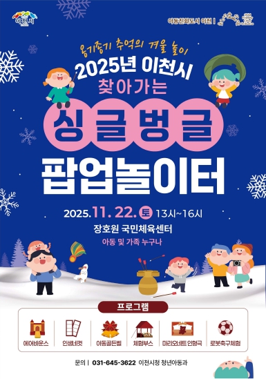 [뉴스스텝] 이천시는 아동친화도시 놀이문화 확산과 아동의 놀권리 보장을 위해 『찾아가는 싱글벙글 팝업 놀이터‘겨울놀이’』행사를 오는 11월 22일 장호원 국민체육센터에서 개최한다고 밝혔다.