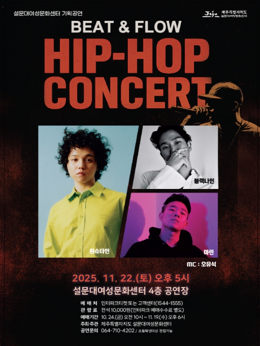 [뉴스스텝] 제주특별자치도 설문대여성문화센터는 ‘설문대 문화의 날’ 11월 기획공연으로 ‘원슈타인·블랙나인·마린 힙합콘서트’를 11월 22일 오후 5시에 공연장에서 선보인다고 밝혔다.