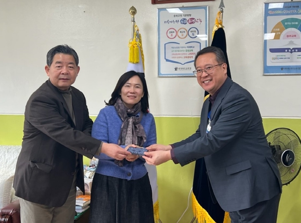 | ▲ 청주시립합창단, 학교 교가 업그레이드 ‘교가 드림’ 진행. 사진(왼쪽부터 이민영 청주시립합창단 예술감독 겸 상임지휘자, 윤남용 문예운영과장, 정성용 청주중앙여고 교장) |