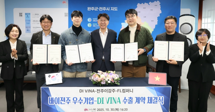 시는 30일 전주시장실에서 우범기 전주시장과 김완엽 DI VINA 대표, 바이전주 우수기업 대표 등이 참석한 가운데 ‘바이전주 우수업체-DI VINA 수출계약 체결식’을 가졌다.