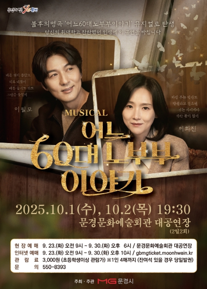 [뉴스스텝] 문경시는 평범하지만 특별한 우리들의 가족 이야기로 대학로에서 많은 사랑을 받았던 뮤지컬‘어느 60대 노부부 이야기’공연을 10월 1일 19:30, 2일 19:30에 문경문화예술회관 대공연장에서 선보인다.