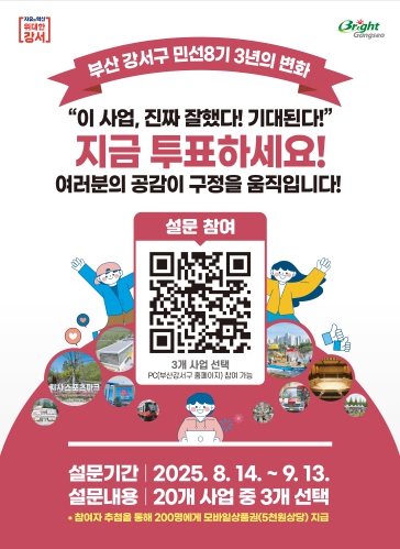[뉴스스텝] 부산 강서구는 민선8기 3년 동안 추진한 주요 사업 가운데 구민 체감도가 높은 사업 선정을 위해 8월 14일부터 9월 13일까지 설문조사를 진행한다.
