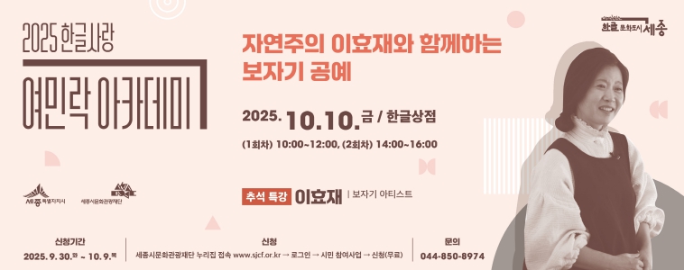 [뉴스스텝] 세종시문화관광재단(대표이사 박영국)은 ‘2025 한글사랑 여민락 아카데미 추석 특별강좌’를 오는 10월 10일 진행한다.