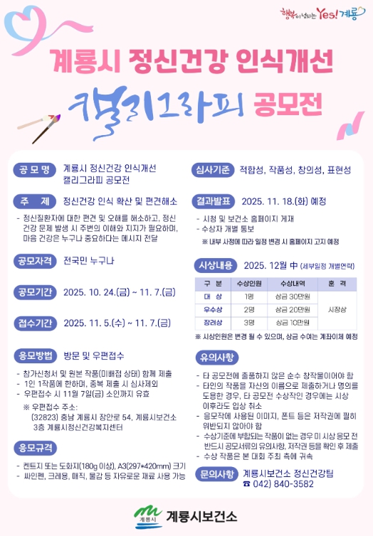 [뉴스스텝] 계룡시는 정신건강 홍보주간(10. 10.∼24.)을 맞아 시민이 직접 참여하는 ‘계룡시 정신건강 인식개선 캘리그라피 공모전’을 개최한다.