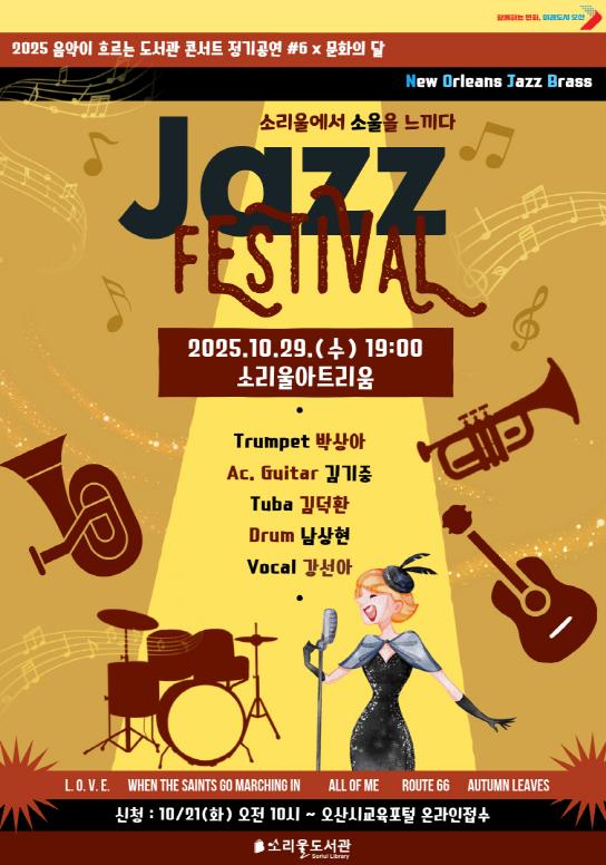 이번 공연은 재즈의 본고장인 미국 뉴올리언스(New Orleans)의 감성을 담은 ‘New Orleans Jazz Brass’가 출연해 트럼펫, 튜바, 기타, 드럼, 보컬이 어우러진 브라스 밴드 사운드로 가을밤의 도서관을 재즈 선율로 물들일 예정이다.