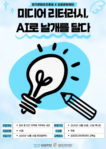 [뉴스스텝] (재)김포문화재단과 경기콘텐츠진흥원은 오는 10월 30일과 31일, 양일간 김포미디어아트센터 교육실에서 '미디어리터러시, AI로 날개를 달다' 디지털 리터러시 및 AI 활용 교육을 공동 개최한다고 밝혔다.