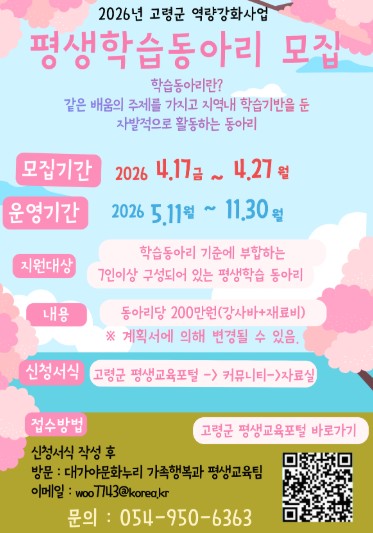 [뉴스스텝] 고령군은 지역 주민의 학습 열기를 확산하고 지속 가능한 학습 생태계를 조성하기 위해, 오는 4월 17일부터 27일까지 ‘2026년 고령군 역량강화 사업’의 일환인 '평생학습동아리' 10개 팀을 모집한다.